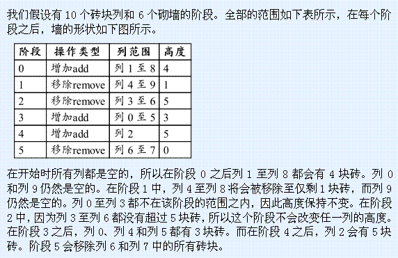 段中,健佳都会被告知一个连续的砖块列的范围,以及一个高度值h,然后他就完成如下过程:在增加砖块(adding